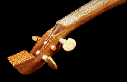 Unlike the lute, whose distinctive bowl-shaped back is made from strips of wood steamed and glued together, the round body of the rebec is formed from a solid piece of sycamore, painstakingly chiselled out to produce a hollow sound box, with three gut strings and a flat spruce soundboard. It is played with a simple horsehair bow and makes a distinctive rasping sound. The two examples shown above are the alto and bass rebecs, made by Bernard Ellis from Herefordshire, England. | ||||||