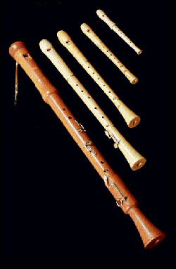 | Although the four members of a recorder consort are usually soprano (descant), alto (treble), tenor and bass - heard together on the sound clip which can be downloaded above - the photograph also features a smaller sopranino recorder, ideal in earlier times for providing dance music out of doors because of its high pitch and loud tone. The smallest recorder, not shown in the photo, is the garkleinflötlein and there are two larger sizes: the great bass and the sub contra bass. | ||||||||