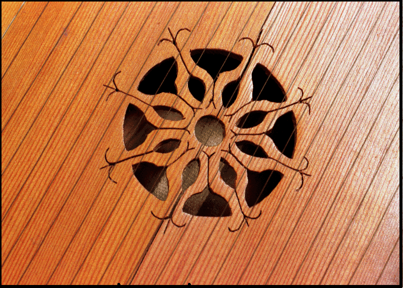 sound each string individually. There is no fretting: each string is simply tuned to a different note (the scale of C on one side with the "accidentals" - the sharps and the flats - on the other). It gives a delightfully high, echoing, ethereal sound - or, if you don't like it, it sets your teeth on edge! The example in the photograph and the sound clip was made by Bob Christian from Cornwall, England. | |||||||