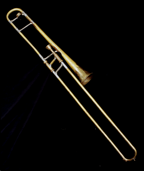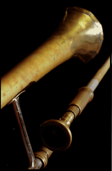 | This brass instrument, the ancestor of the modern trombone, dates back to the 14th Century, when it was popular right across Europe. Variously spelt "sackbut" or "sagbut", it is basically a slide trumpet which allows the player to alter the length of the sound tube as he/she plays. As the sound tube is extended, the notes get lower. During the 17th Century, a consort of sackbutts would normally include an alto, tenor and bass. In England, King Henry VIII had his own consort of ten sackbutts at court, and by the early 1600s England was considered to be a centre of excellence in sackbutt playing. |