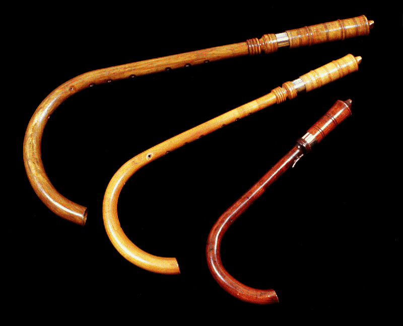 very distinctive nasal buzzing sound which you either love or hate, but suffered from a very limited range of just over one octave - unlike recorders, they cannot be overblown to play higher notes - and had gone out of fashion by the end of the 16th century. King Henry VIII was a skilled crumhorn player and had his own collection of the instruments. The photograph above shows soprano, alto and tenor crumhorns. No explanation has been given for their odd shape: the curved end does not make any difference to the tone or volume of the instrument. | |||||||