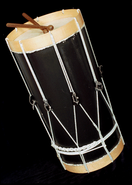 | This military drum was developed in the 15th Century from earlier medieval drums. Usually played by boys - considered too young to fight - these drums were used during battles as a means of signalling to soldiers where the main body of the army was fighting. The drum has a painted wooden shell with calf or goat skin drum heads at either end. Unlike modern military drums, which use screw tensioners, the skins on the renaissance long drum are tensioned (made slacker or tighter) by rope slides which pull the wooden hoops at each end towards each other and thus stretch the skins over the body of the drum. Percussion from drums, tabors and timbrels is one of the most distinctive features of medieval and renaissance music. |